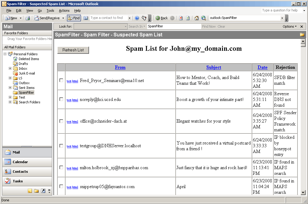For corporations using Microsoft Outlook email clients, a very nice feature is the ability to display a "SpamFilter" folder within the Outlook client itself. This web-enabled folder then allows the end users to see their quarantined emails directly within their Outlook client without the need of an external web browser. From Outlook they can then view/deliver any emails in the quarantine.